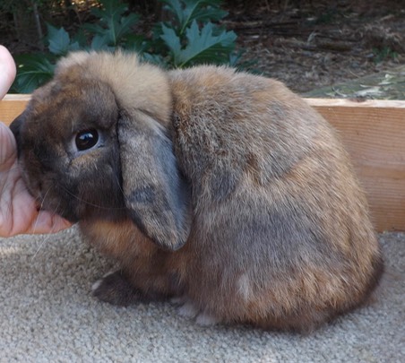 BUNNYLOPS’ SOCRATES (Schwandt’s Crunch (2 legs), Broken Chocolate Tort X Basso’s Foreshadow, Chocolate) born 3/24/2015, went to Backwoods Buns Rabbitry in Swainsboro, GA with Jamie.